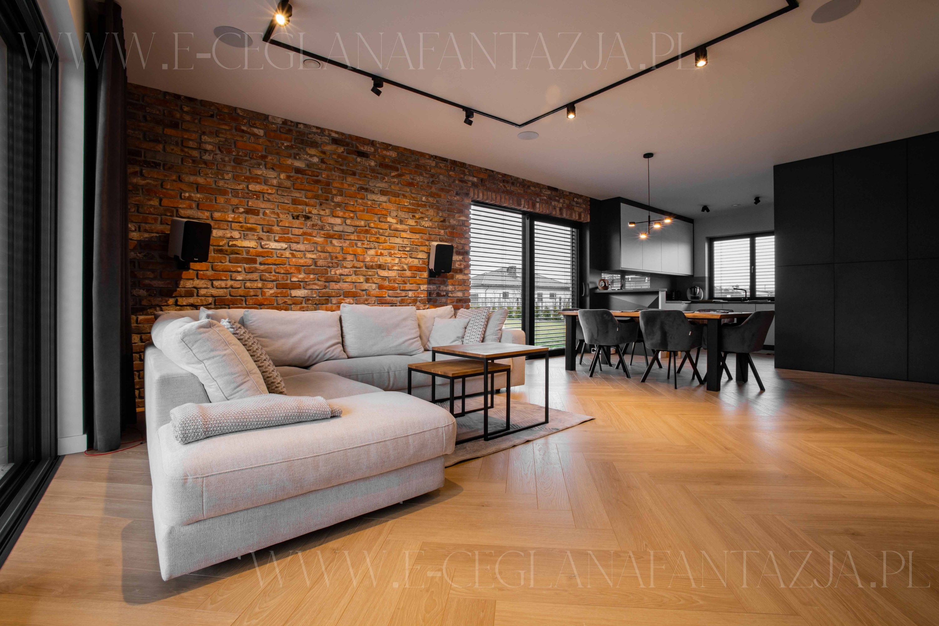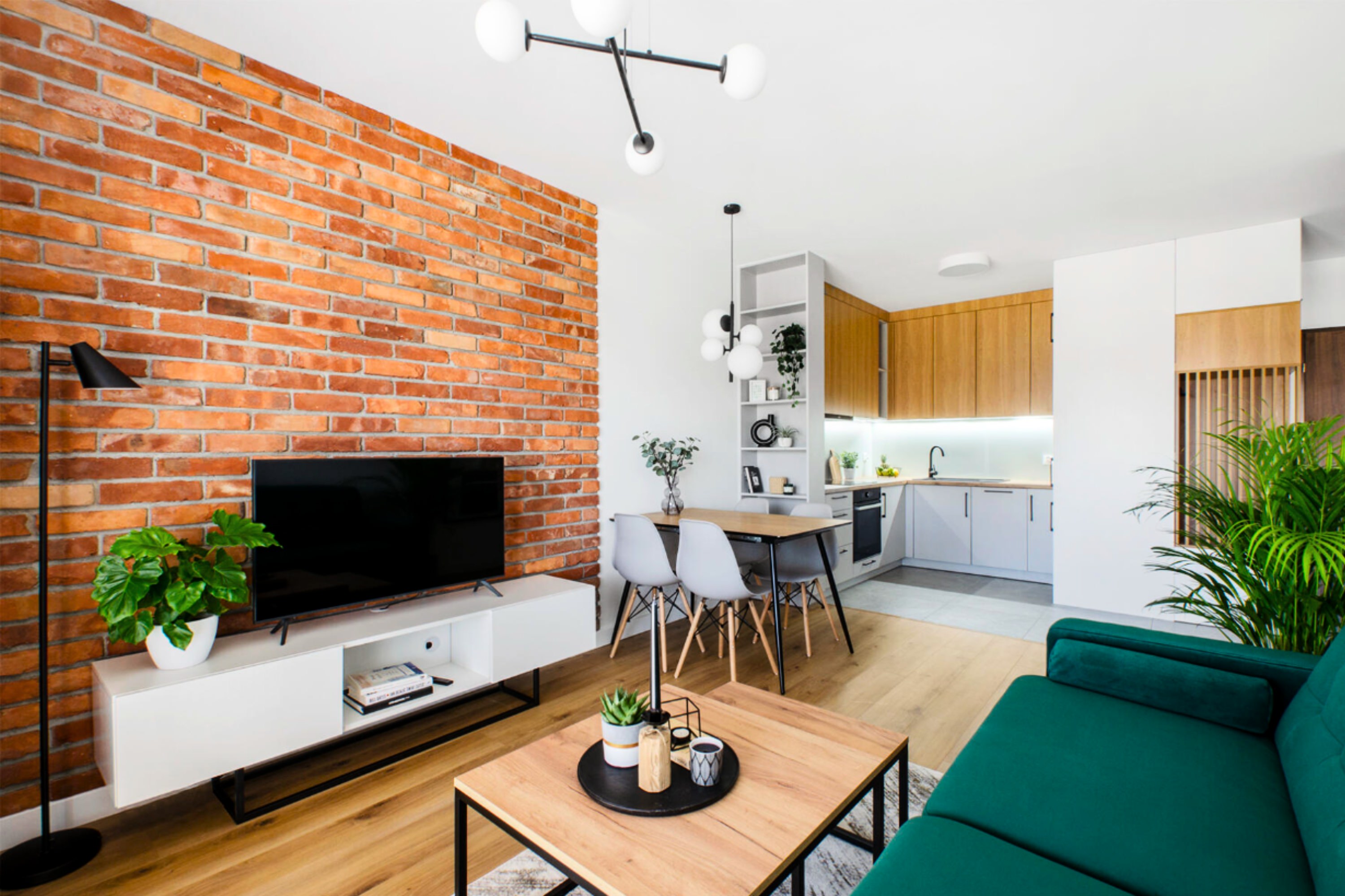 - Salon z jadalnią i ceglaną ścianą