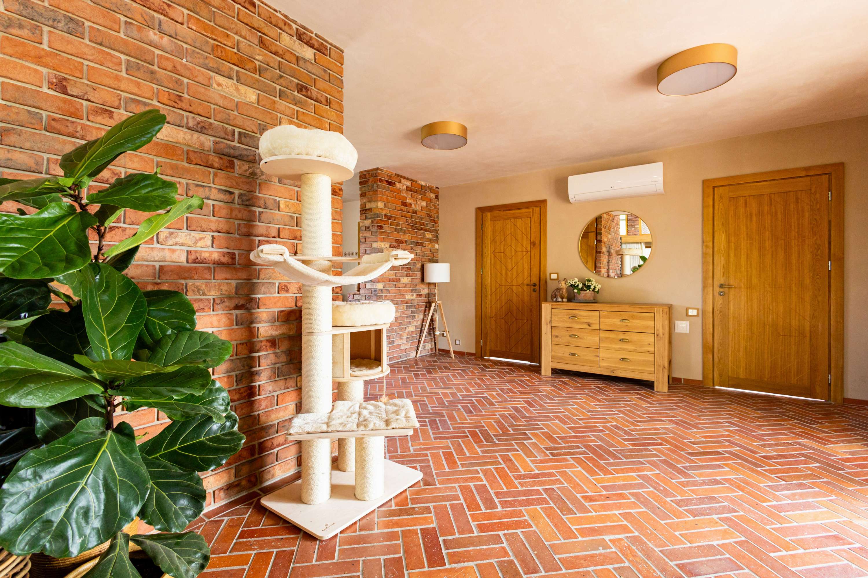 - Wnętrze wykończone cegłą rozbiórkową na ścianie i podłodze