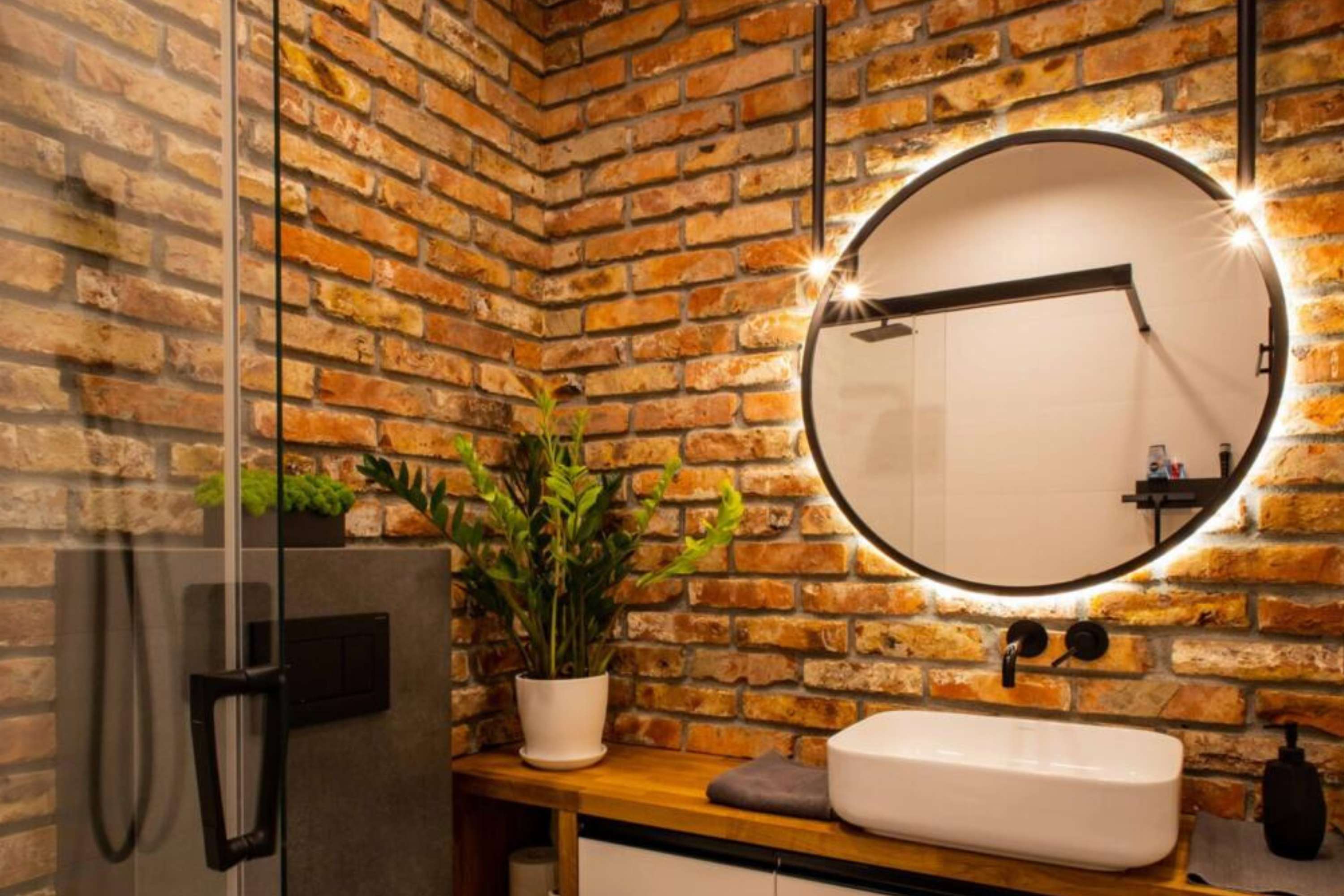 - Loftowa łazienka z płytkami ceglanymi na ścianie
